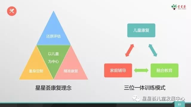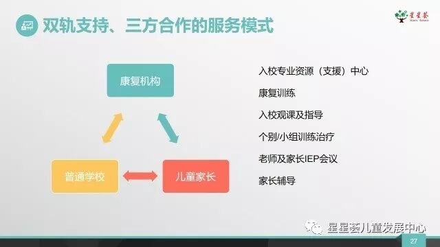 2、在早期儿童康复干预支持中,星星荟始终坚持“以人为本、以儿童为中心”的教育理念和“儿童康复、家庭辅导和融合教育”康教结合三位一体训练模式,强调:“重视建立儿童兴趣、信心、动机,源于生活,用于生活,因特质施教”的情景课程设计及组织儿童实境操练自我泛化的主题活动设计开展理念。