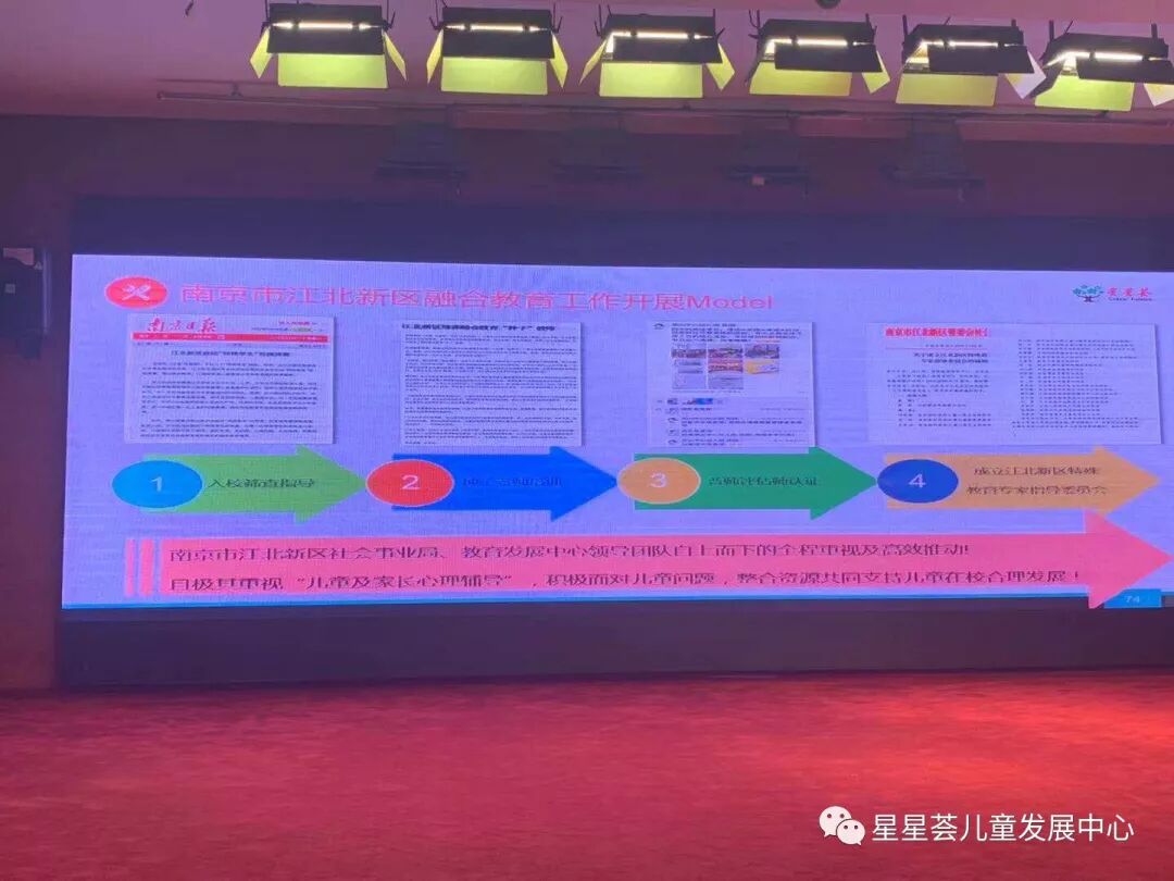 3、周寅葵主任还着重分享到:融合教育是全社会性的合力支持的系统工程,除了家校合作、医康教跨界协作,还需要政府政策上自上而下的推动,并用“南京市江北新区的融合教育在江北新区社会事业局民政、教育、残联等多方合作的model”分享了具体工作开展流程。
