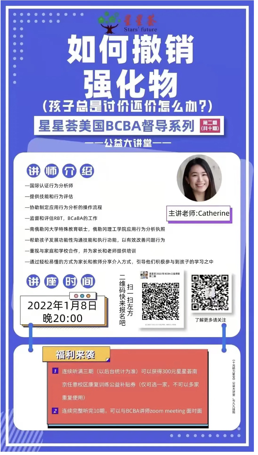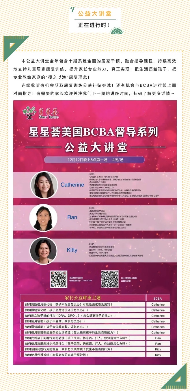 星星荟(中国)第二期家长公益大讲堂在1月8日晚8点重磅来袭,由BCBA督导Catherine讲解《如何撤销强化物》。上期学习了如何高效使用强化物,但我们还要思考在强化物高频使用后该如何撤销强化物,具体该怎么做呢?