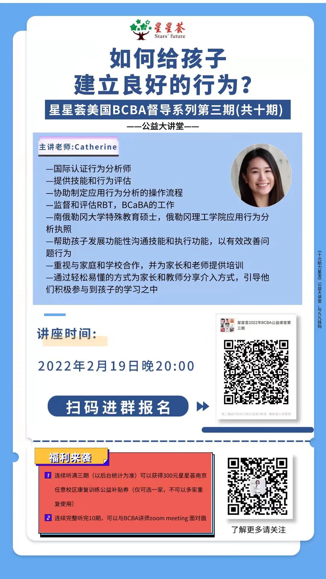 星星荟(中国)第三期家长公益大讲堂在2月19日晚8点重磅来袭,由BCBA督导Catherine讲解《如何给孩子建立良好行为》。日常生活中,小朋友的不良行为常常让家长头疼,束手无策,那建立良好行为具体该怎么做呢?