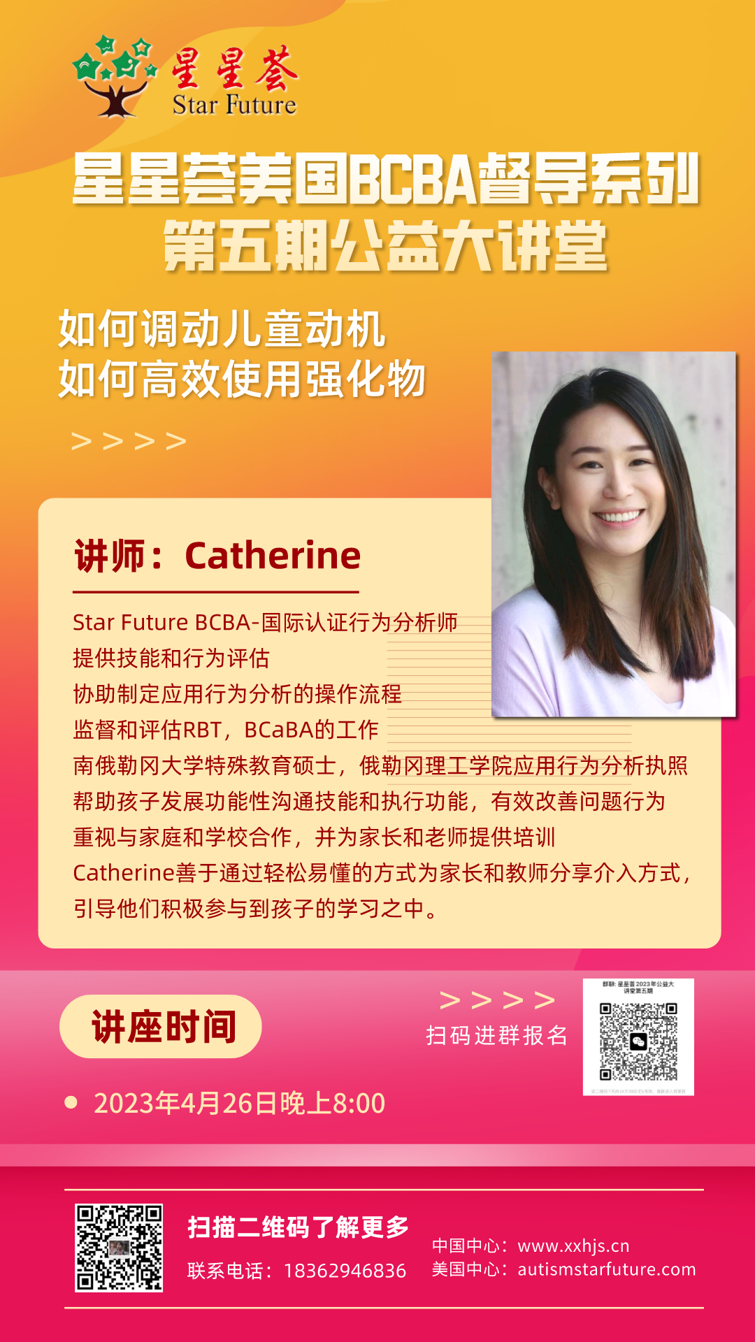 此次讲座由星星荟BCBA督导Catherine担任主讲人,在线帮助大家从强化与惩罚的技巧入手,分析讲解调动儿童动机的方法。