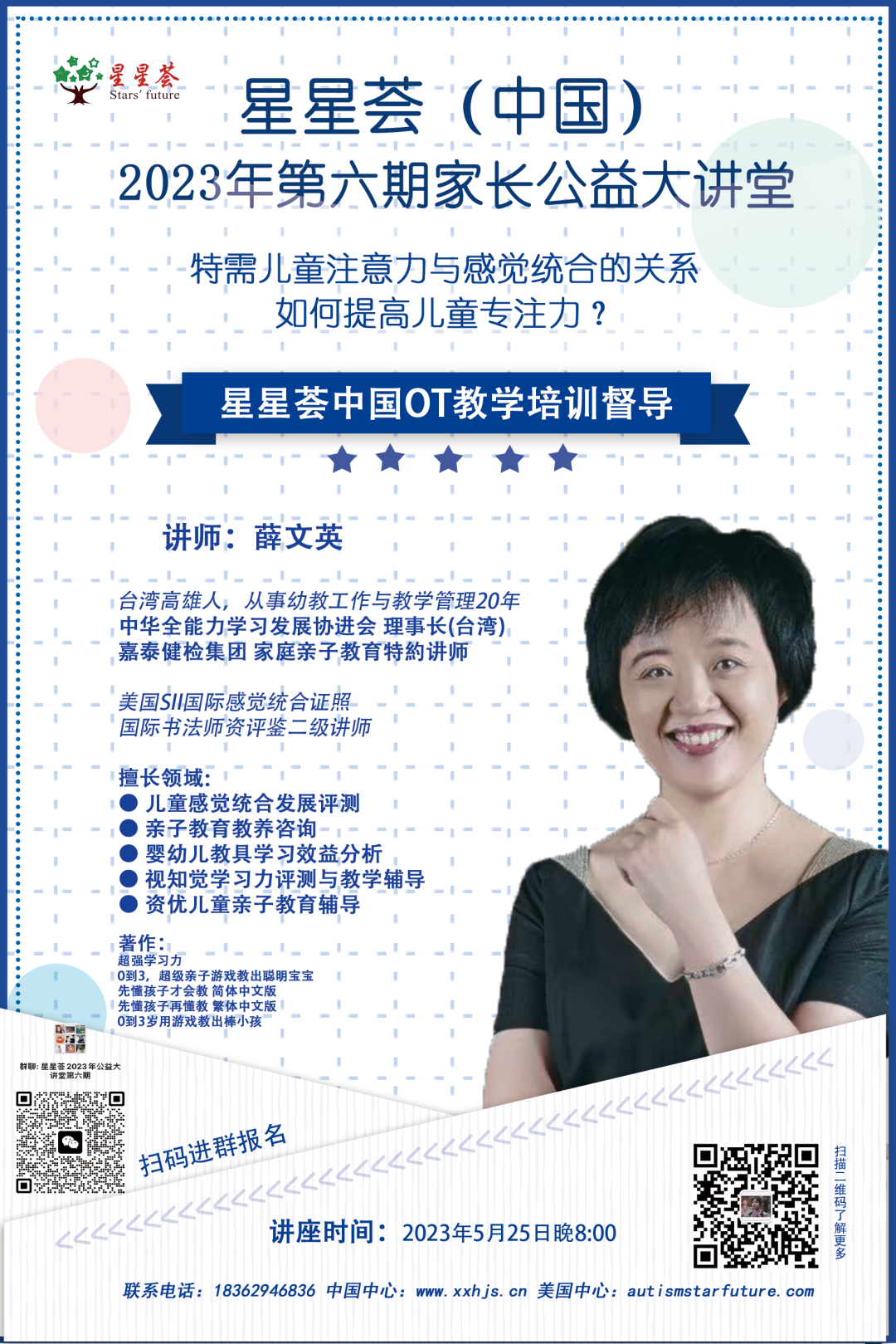 为了让家长从感觉统合的角度了解影响儿童专注力的因素,学习提高儿童专注力的策略,星星荟(中国)于2023年5月25日晚上八点开展了“星星荟公益系列讲座第六期——《特需儿童感觉统合与注意力的关系》如何提高儿童专注力”公益讲座。
