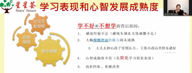 薛老师提出,家长和老师需要了解儿童的发展阶段,知道几岁应该有什么样的技能,总结孩子无法专心的原因,概括为5点: