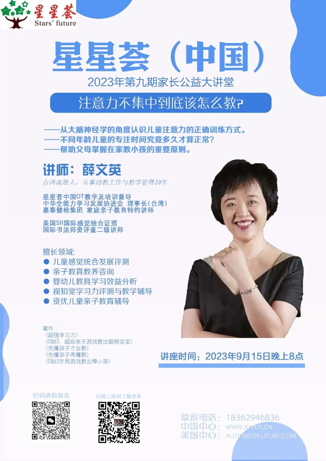 本期公益大讲堂特邀星星荟(中国)OT教学及培训督导薛文英老师为各位家长系统化的从不同方面讲解有关注意力的问题。