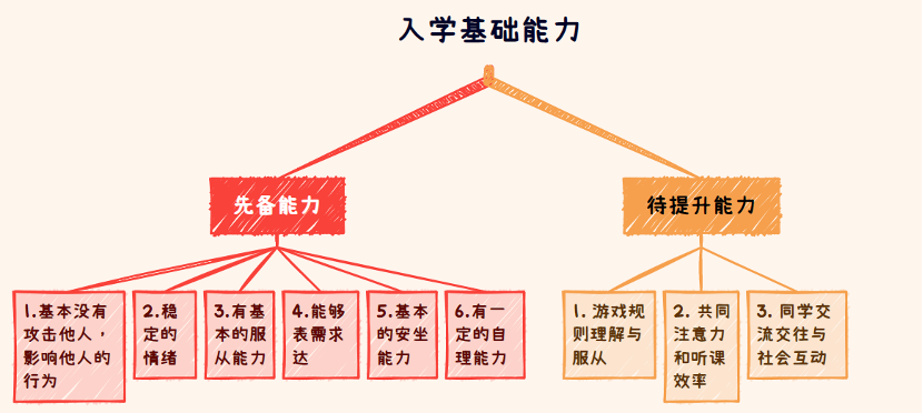 在入校筛查、影子老师服务项目以及往期学前强化班的学生观察中,我们会发现,很多小朋友在进入幼儿园后在座位上小动作不停,容易被教室外的声音分散注意力,总喜欢碰别人或容易紧张等等,难以适应幼儿园常规流程以及活动切换、甚至因不恰当行为被退学。很大一部分小朋友虽然表达能力没有问题但仍然未被幼儿园录取,这些都和入学基础能力有关,那么学前入学需要具备哪些能力?