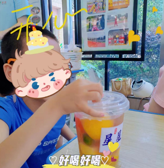 一杯酸酸甜甜的水果茶就做好啦!小朋友们拿着自己做的水果茶喝得津津有味~