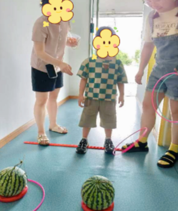 小朋友们化身家长的“人形GPS”,谁能最快带着自己的爸爸妈妈走到西瓜处贴上三个瓜子 呢?要注意方向哦!可不要越走越走越远啦!