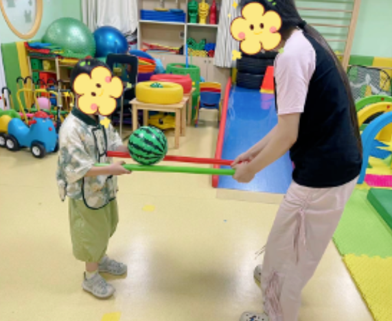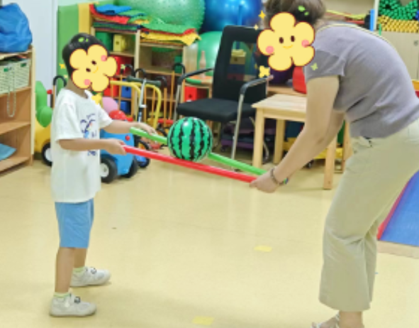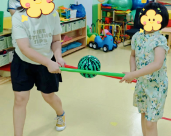 圆滚滚的西瓜和彩色的体能棒真是一组好搭档,小朋友和家长互相配合,手拿体能棒两端运瓜。嘿咻嘿咻,脚步一致才能更快走到终点哦~