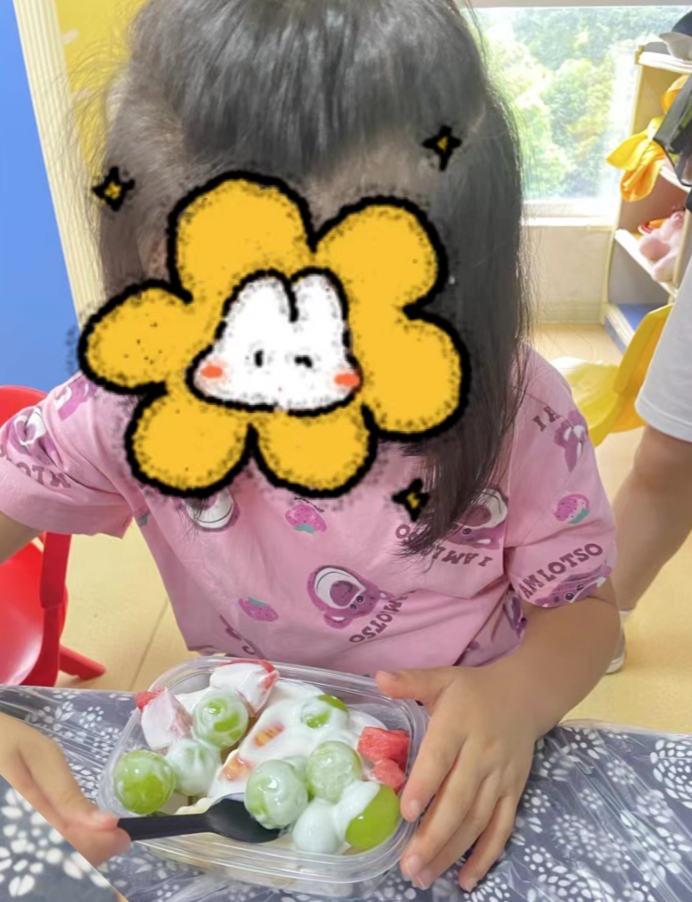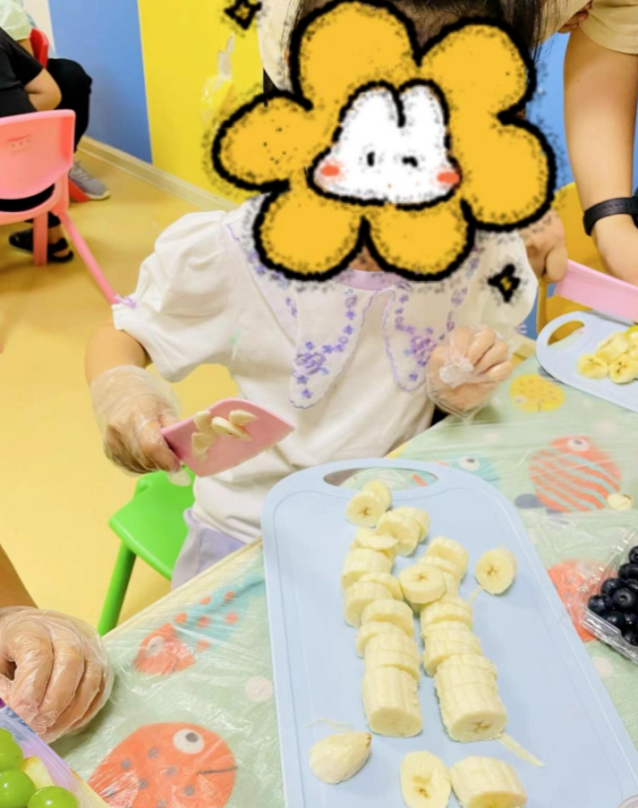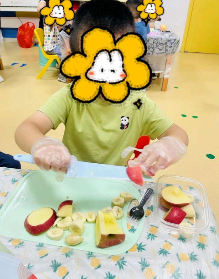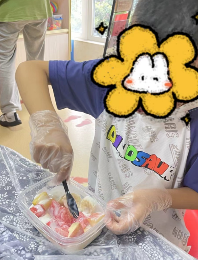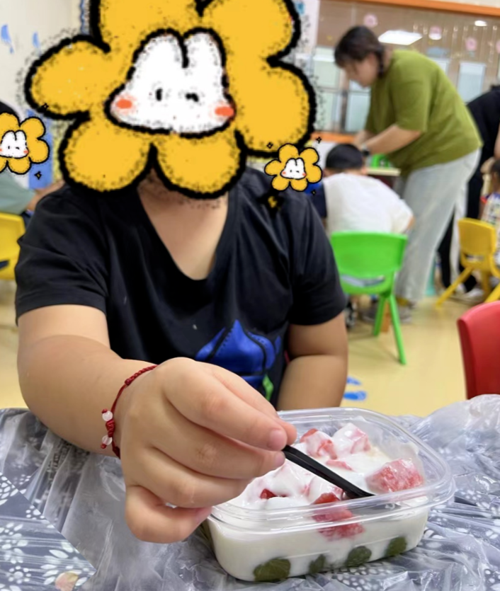 小小甜品师们闪亮登场,大家按照步骤有条不紊地操作着,有的在切,有的在搭配水果,有的在搅拌酸奶,哇还有小朋友已经开动啦,自己做的水果捞好像更加美味呀!